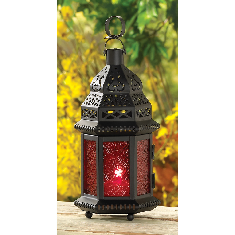 The combination of intricate metal cutouts and ornate glass designs create a gorgeous effect of flickering ruby red light that can either set the tone for outdoor events or cast an exquisite glow on your tabletop. Hinged glass panels make it easy to place the candle or LED light of your choice and is ideal for festive parties, weddings, outdoor lighting or as gifts. Available is a variety of colors including green, red, clear, mulberry, blue, yellow, purple, or amber - find the Moroccan Style Lantern that best fits your home.