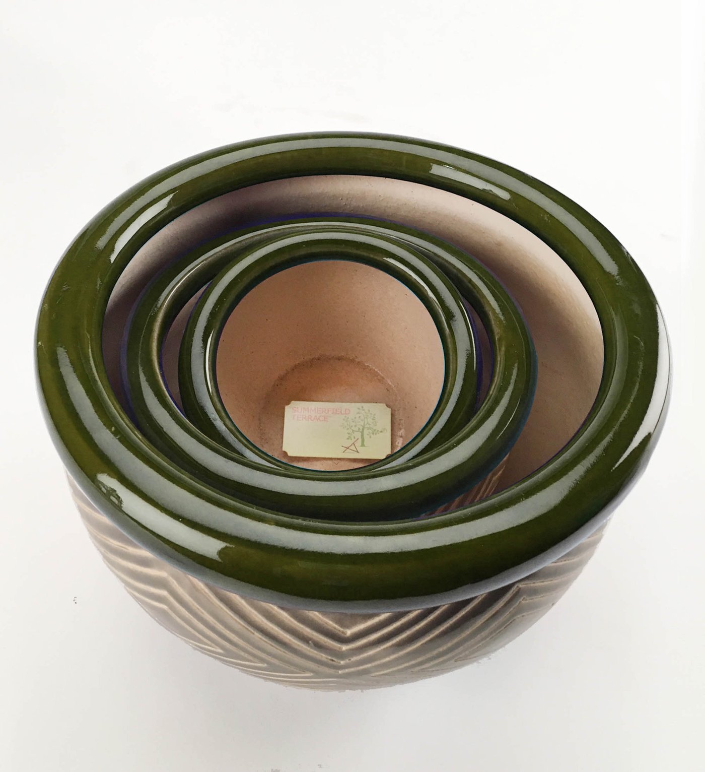 • Lush shades of sand and jade add natural elegance to your favorite plants, showing them off to stunning effect! Coordinating pots in three separate sizes create an effortless designer look. The bottom of each planter features a small drain hole to ensure your plant stays happy and healthy.