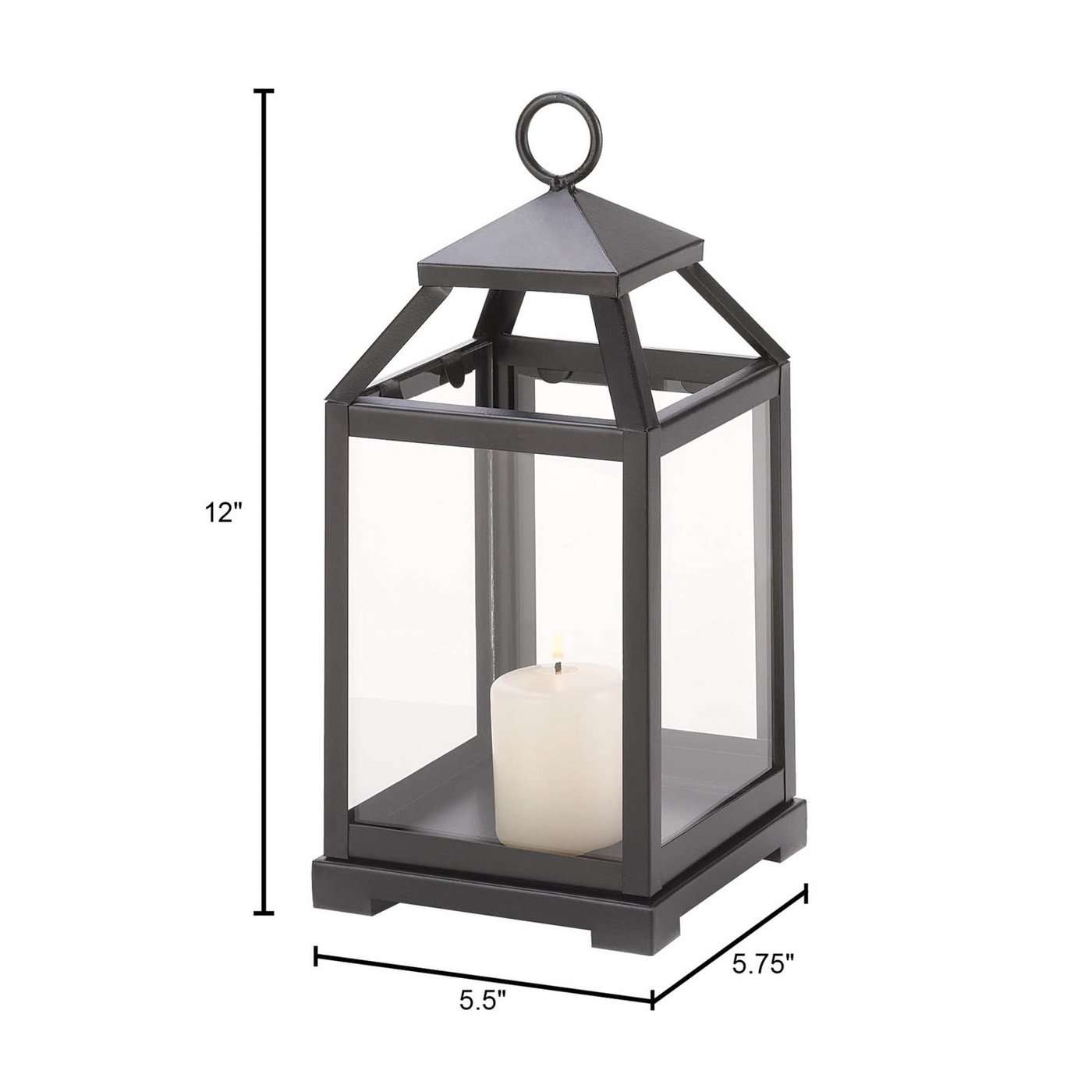 • Squared glass-paned lantern gets geometric appeal from a simple silhouette and classic matte-black finish. Safely houses a stately pillar candle for hours of enchanting light! Loop at top for hanging; can also stand freely on table or shelf.