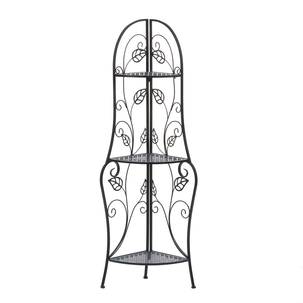 • A sweet treat for any room, this corner baker shelf will display your plants, collectibles and more while enhancing your room with its pretty design. Trellis-inspired shelves climb up the curling metal frame that's decorated with lovely leaves.