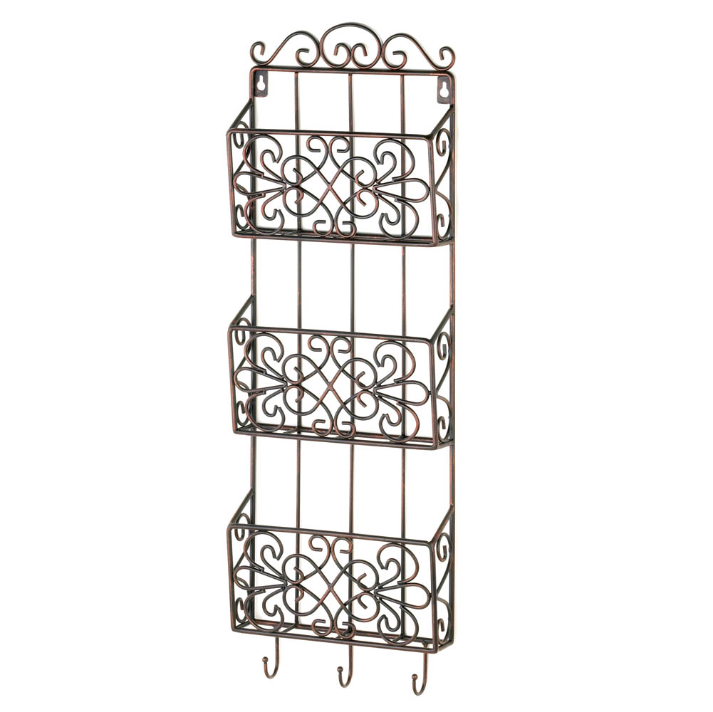 • Organize your mail, magazines and more with this gorgeous decorative wall rack. It features three pretty bins for your important papers, and below three hooks await your car keys, light accessories and more.