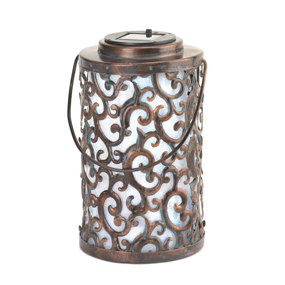 • The gorgeous iron swirls and flourishes make this solar-powered lantern a beautiful accent for any outdoor space. The built-in solar panel at top will soak in the sun's rays all day long, and by night the interior will glow with magical light.
