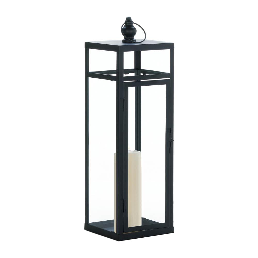 Your search for a dramatic lighting accent that will amp up the style in your room is officially over! This incredible black metal lantern has a beautifully crisp geometric frame and clear glass panels to show off your favorite candle. Weight 5.6 pounds. 6.75" x 6.75" x 22.5". Height w/loop: 24 1/2". Iron, Glass. UPC Number: 849179035402.