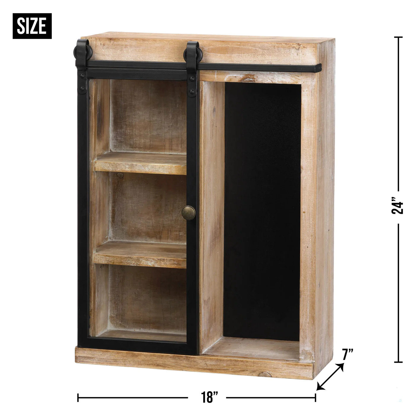 • For extra storage place this unique wall shelf in a bathroom, closet, mud room, or anywhere else you require. The rustic appearance and design of the cabinet will seamlessly fit with farmhouse décor and the sliding glass barn door attached to this cabinet is a unique and fun feature.