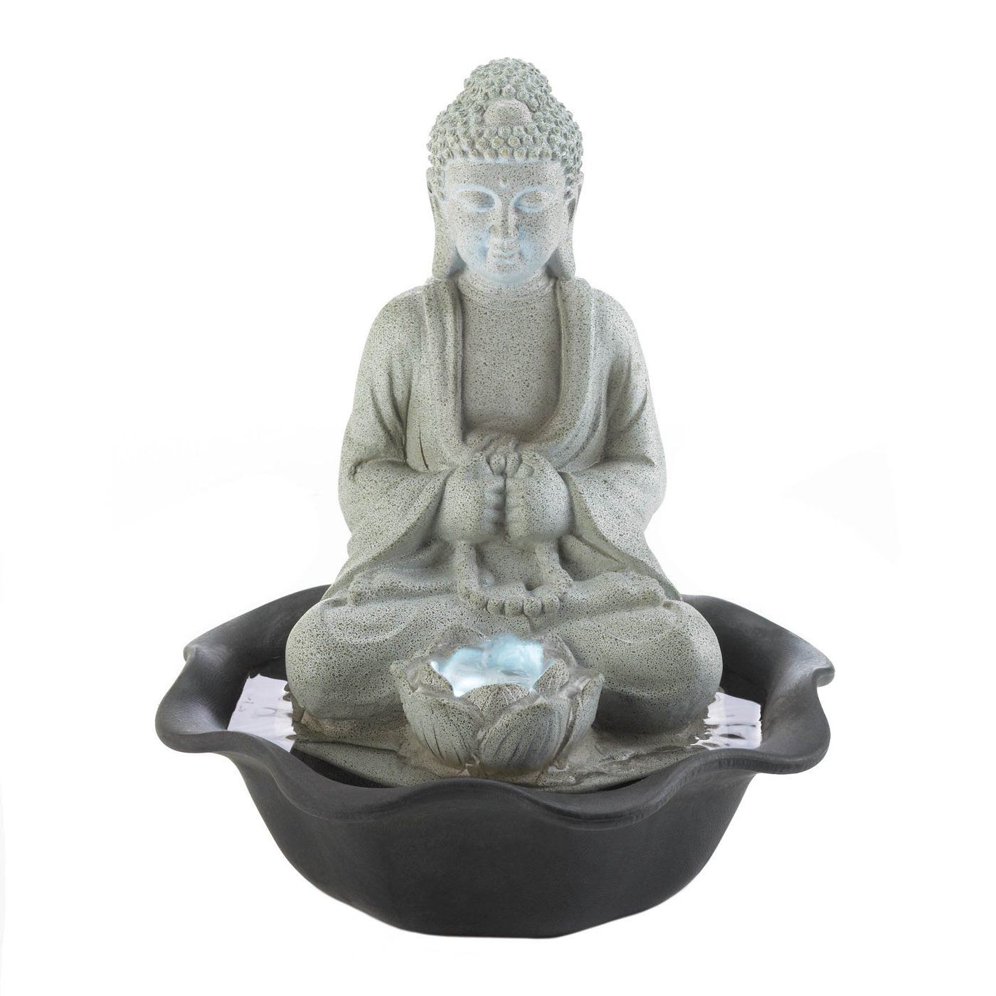 Bring nature inside with this serene meditating buddha tabletop fountain. This indoor water fountain is made from durable polyresin to give it a stone-like appearance. It also includes an LED light for a stunning evening display. The calming water sounds and natural stone design will turn your space into a place of Zen. Place on the entryway table to greet guest, in a master bath for a tranquil soak in the tub, or any else you think this might fit perfectly. Weight 2.80 lb. 10.25" x 10.25" x 11.00". Polyresin, LED Light. UPC Number: 849179042752. To clean your fountain; dust lightly, or wipe with damp cloth as needed.