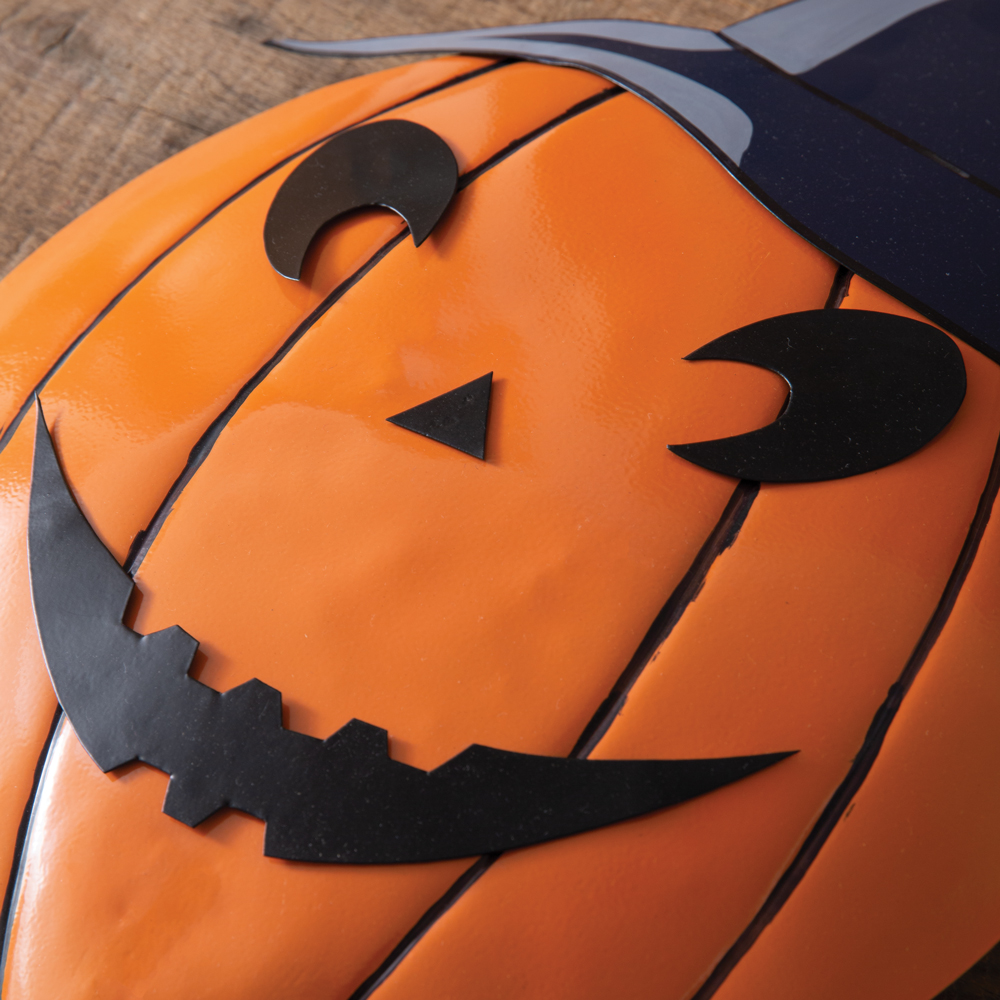 Welcome your trick-or-treaters with this witchy jack-o-lantern on Halloween night. This garden stake is over 2ft tall and is crafted from metal.