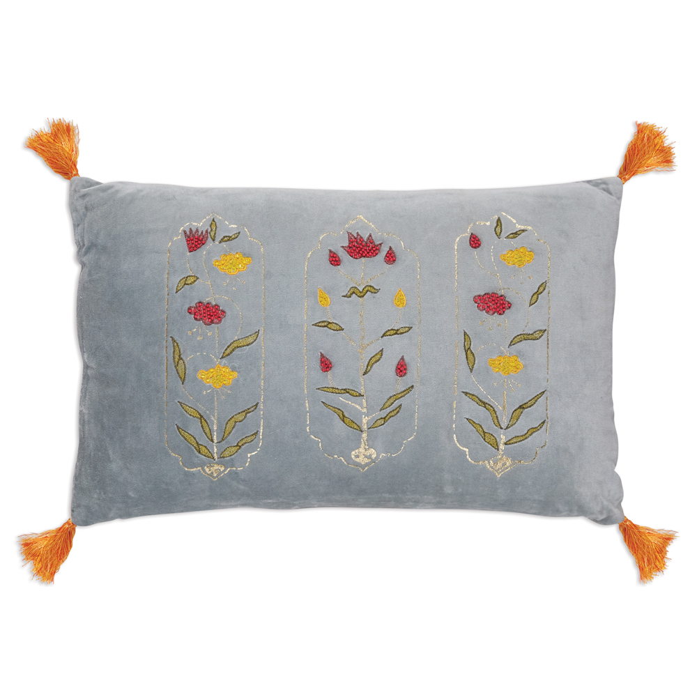 Switching up your space is a breeze with our square throw pillow. It features velvet material with beaded flowers and pom pom edges. Display on a sofa or bed. This pillow comes with a polyfil insert.