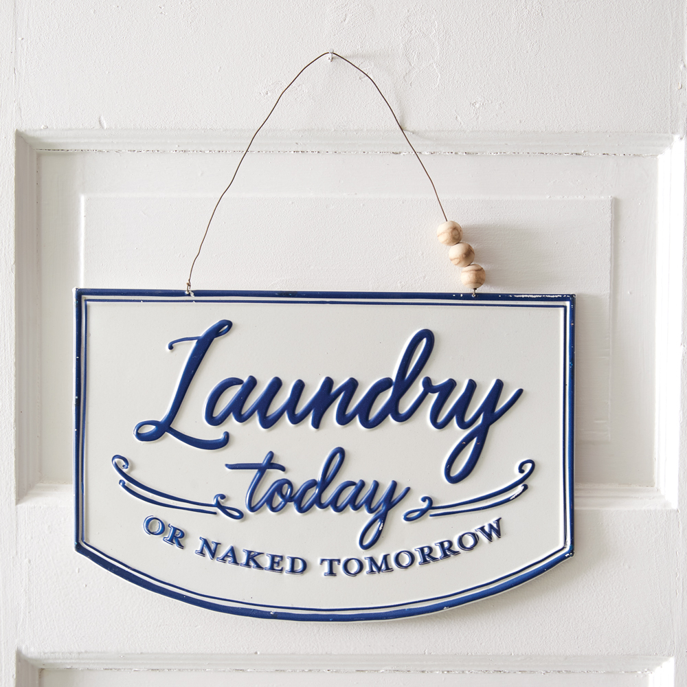 Why not tell it like it is? When you don't do your laundry there are consequences. This fun little sign is made of metal and hangs with a metal wire that holds three wood beads.