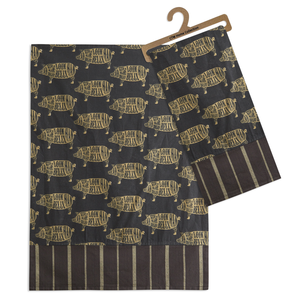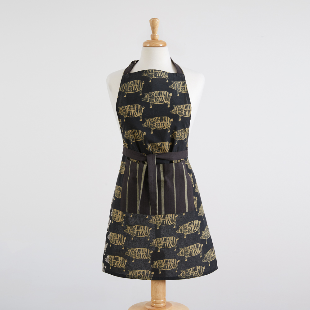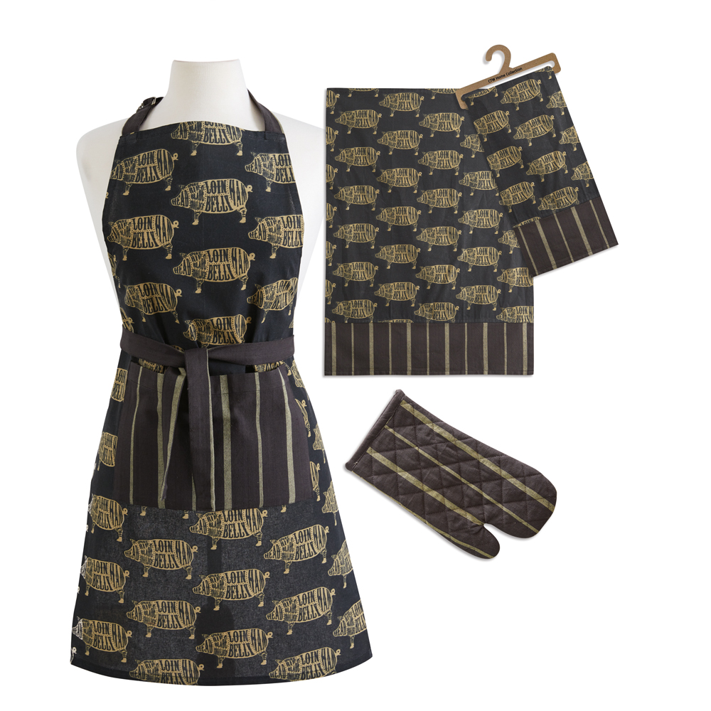 Featuring all of the butcher cuts from a pig, this kitchen essentials set is a great addition to farmhouse decor. Set includes an apron, tea towel, and oven mitt. Tea towel is 20''W x 28''H and oven mitt is 7''W x 13''H. Apron has a neck tie, a waist tie, and a pocket in the front. Made of 100% cotton. Tea towel features a corner hanging tab. 100% Cotton. Machine wash cold. Tumble dry. Warm iron on reverse. Pot holder has a hanging loop for easy storage.